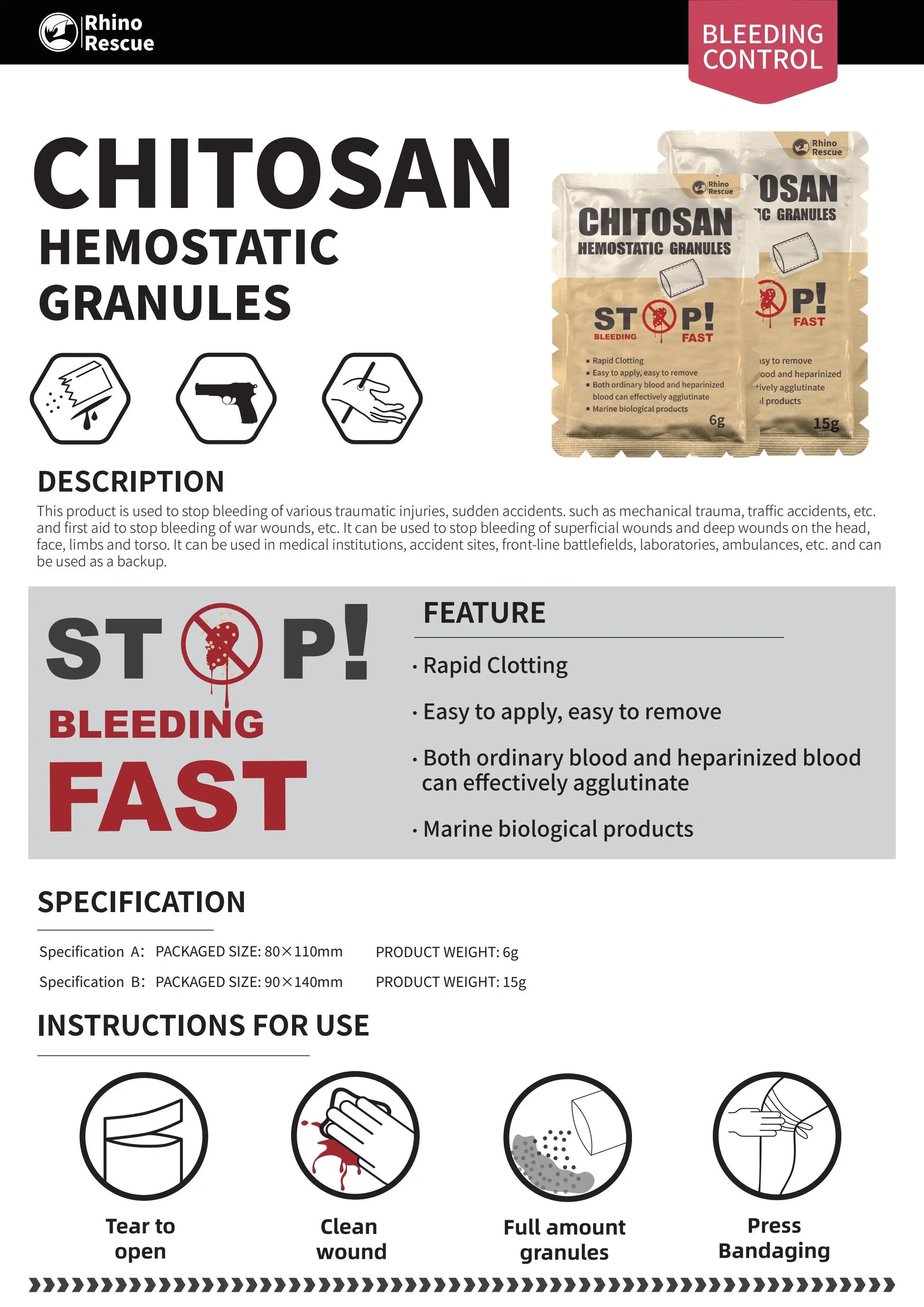 Rhino Rescue is easy to use (just pour, pack and apply pressure), very safe and extremely effective.You can rely on Rhino Rescue to stop bleeding when you need it most without generating heat.