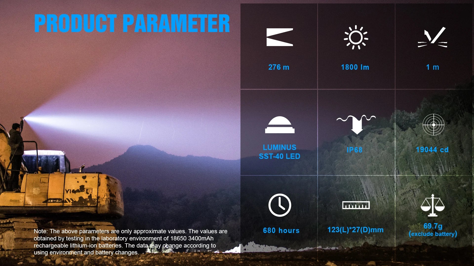 T11R has extremely high reliability and operability, up to 1800 lumens, with intelligent temperature control and low voltage warning, powered by a 18650 rechargeable lithium ion battery; adopting USB Type-C charging technology, IP68 level dustproof and waterproof, can be used in complex and changeable outdoor environments; one-button quick modes switch on the neck, tactical switch on the tail cap and anti-drop height up to 1 meter, let you use it in outdoor and work environment with confidence.